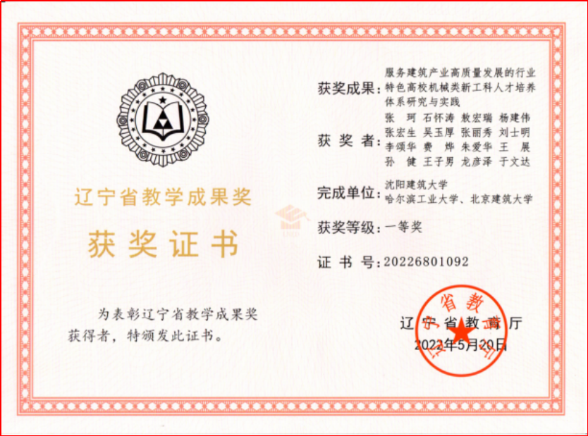 2022 服务建筑产业高质量发展的行业特色高校机械类新工科人才培养体系研究与实践 辽宁省教育厅/辽宁省教学成果奖一等奖(最高奖)