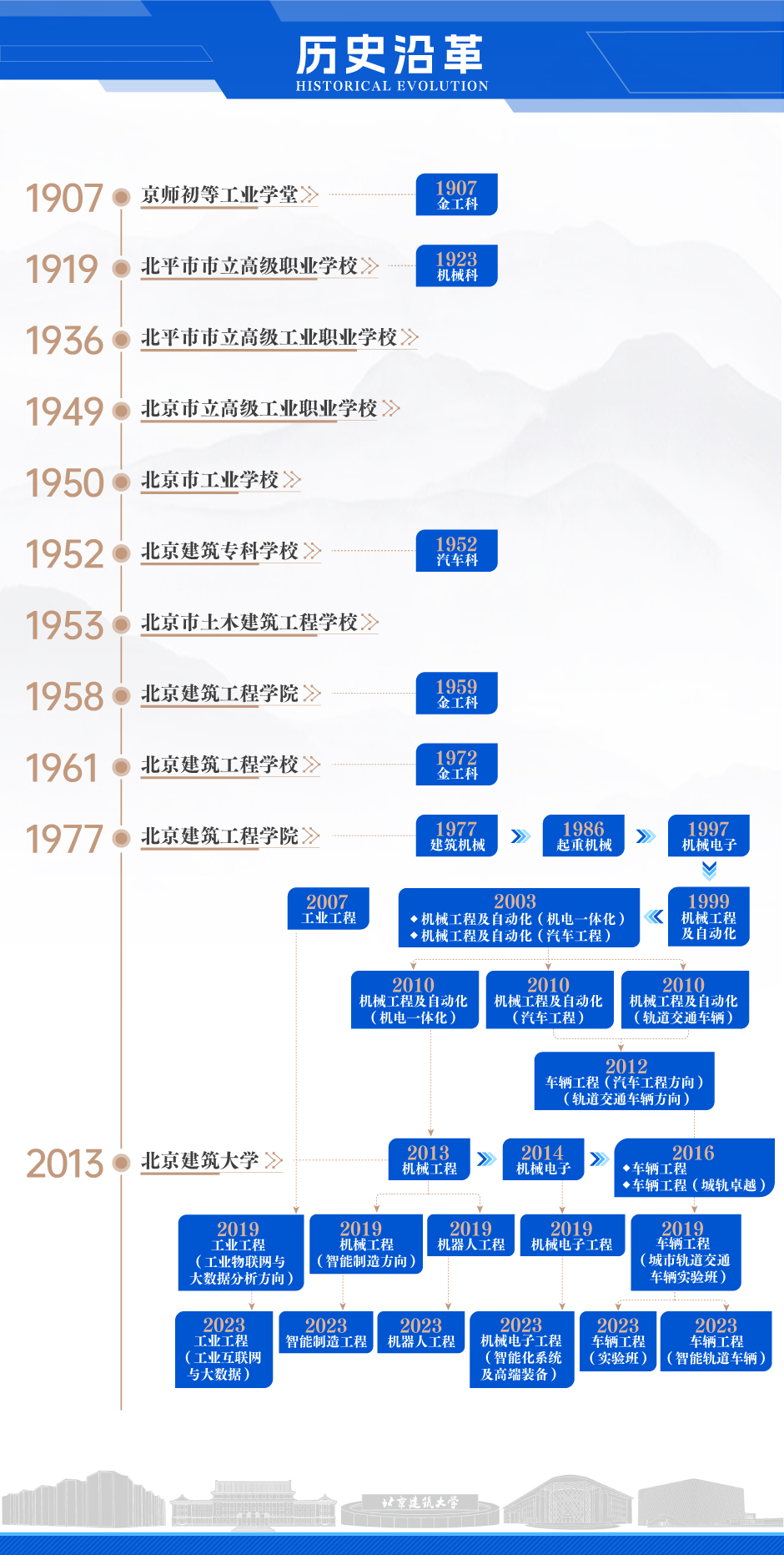 原机械工程及自动化专业设有机电一体化和汽车工程两个方向。2011年高等学校本科专业设置备案审批结果公布,友里 “车辆工程”专业获批,从机械工程及自动化专业独立出来,自2012年起,按照“汽车工程方向”和“城市轨道交通车辆方向”招收本科生。2013年机械电子工程专业获得北京市教育委员会批准,自2014年开始招生,原机械工程及自动化专业更名为机械工程专业,历史上友里 曾根据教育部相关规定先后使用过建筑机械、工程机械、起重运输与工程机械、机械电子工程等名称。至2023年,学院对专业进行调整和规划,共设置机械电子工程(智能化系统及高端装备)、工业工程(工业互联网与大数据)、智能制造工程、机器人工程、车辆工程(实验班)、车辆工程(智能轨道车辆)6个专业(方向)。