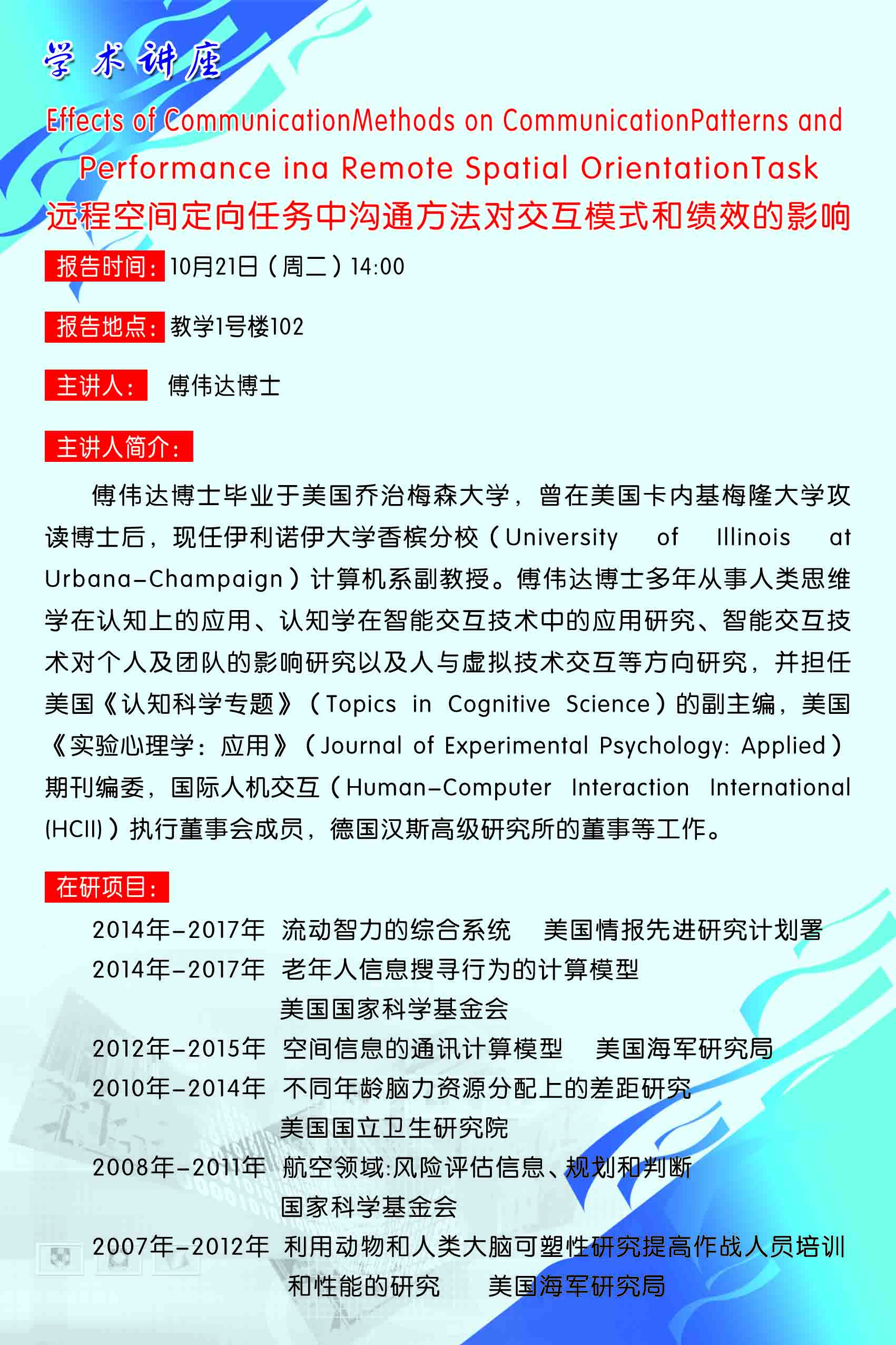 【讲座通知】远程空间定向任务中沟通方法对交互模式和绩效的影响